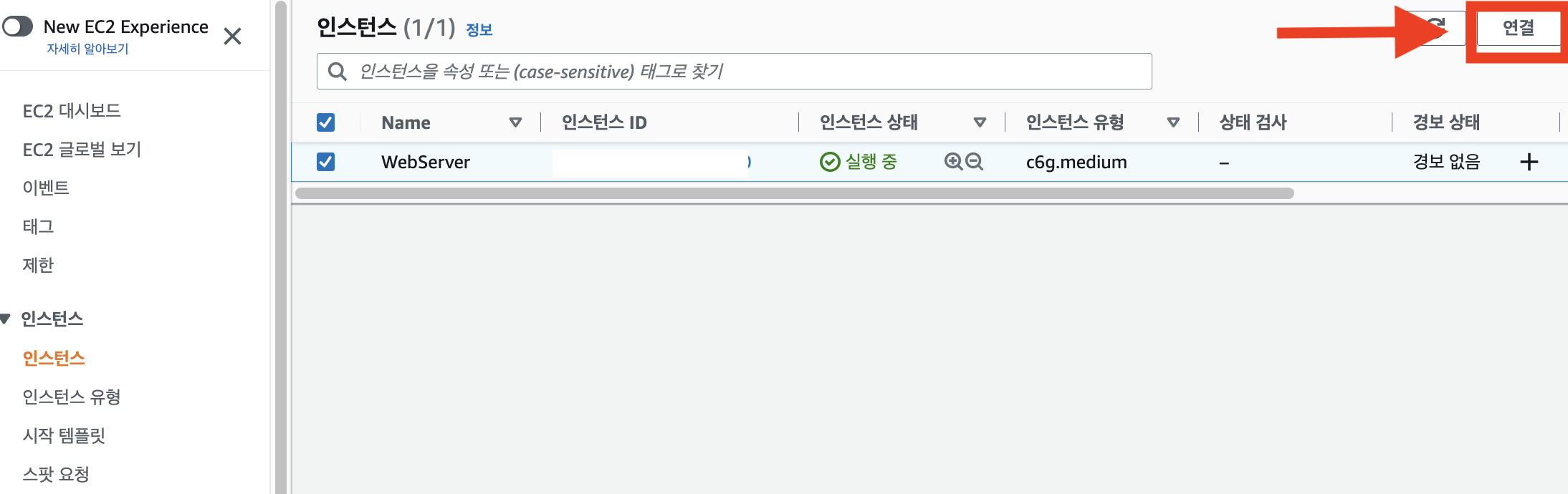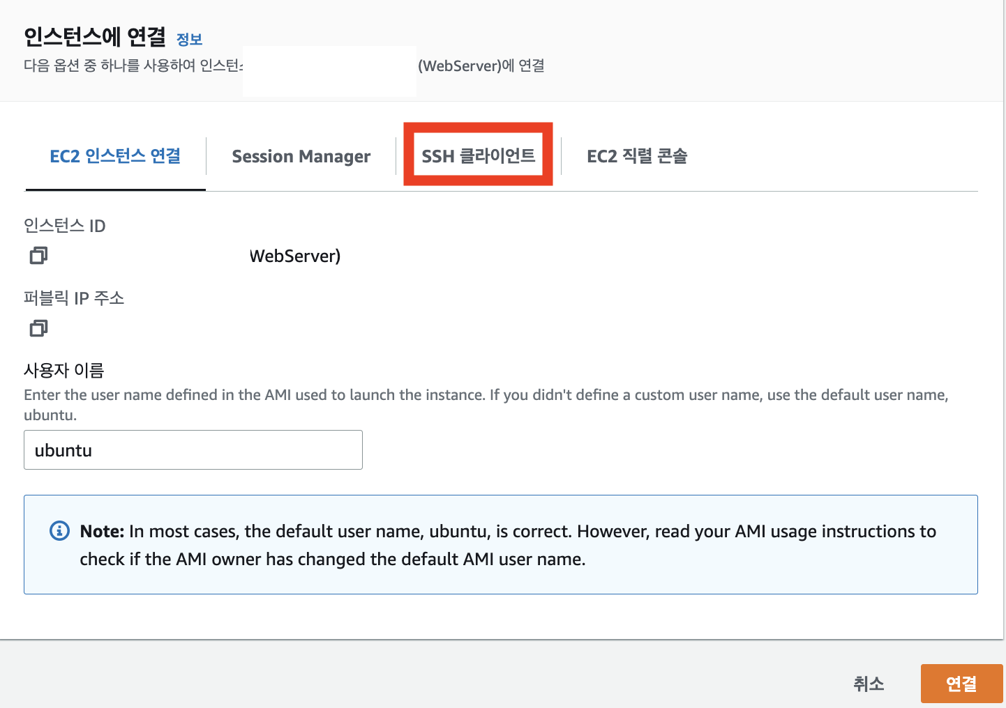 - 인스턴스 탭에서 인스턴스 선택 후 연결버튼을 클릭하고, SSH 클라이언트 탭을 클릭합니다.