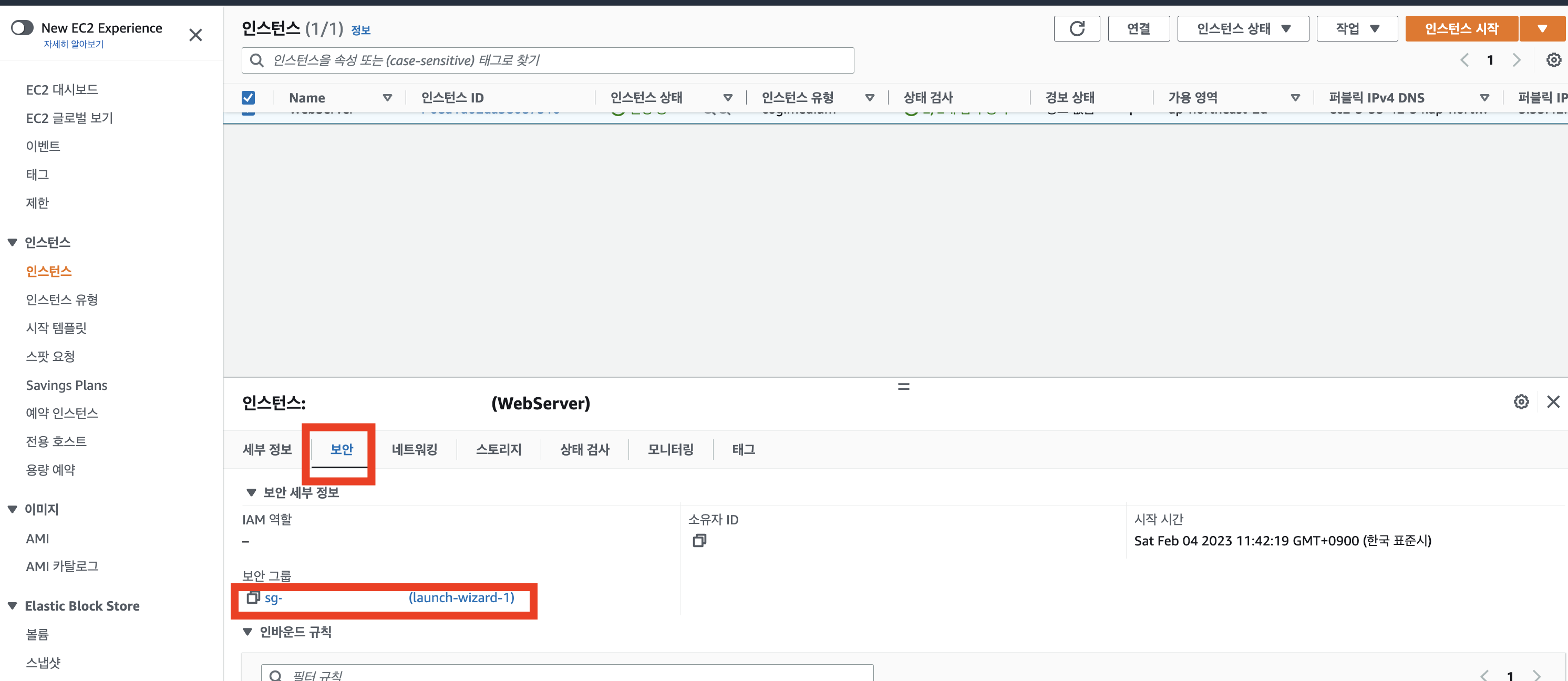 인스턴스 페이지에서 '보안'을 클릭합니다. 보안 그룹의 빨간 박스를 클릭합니다.