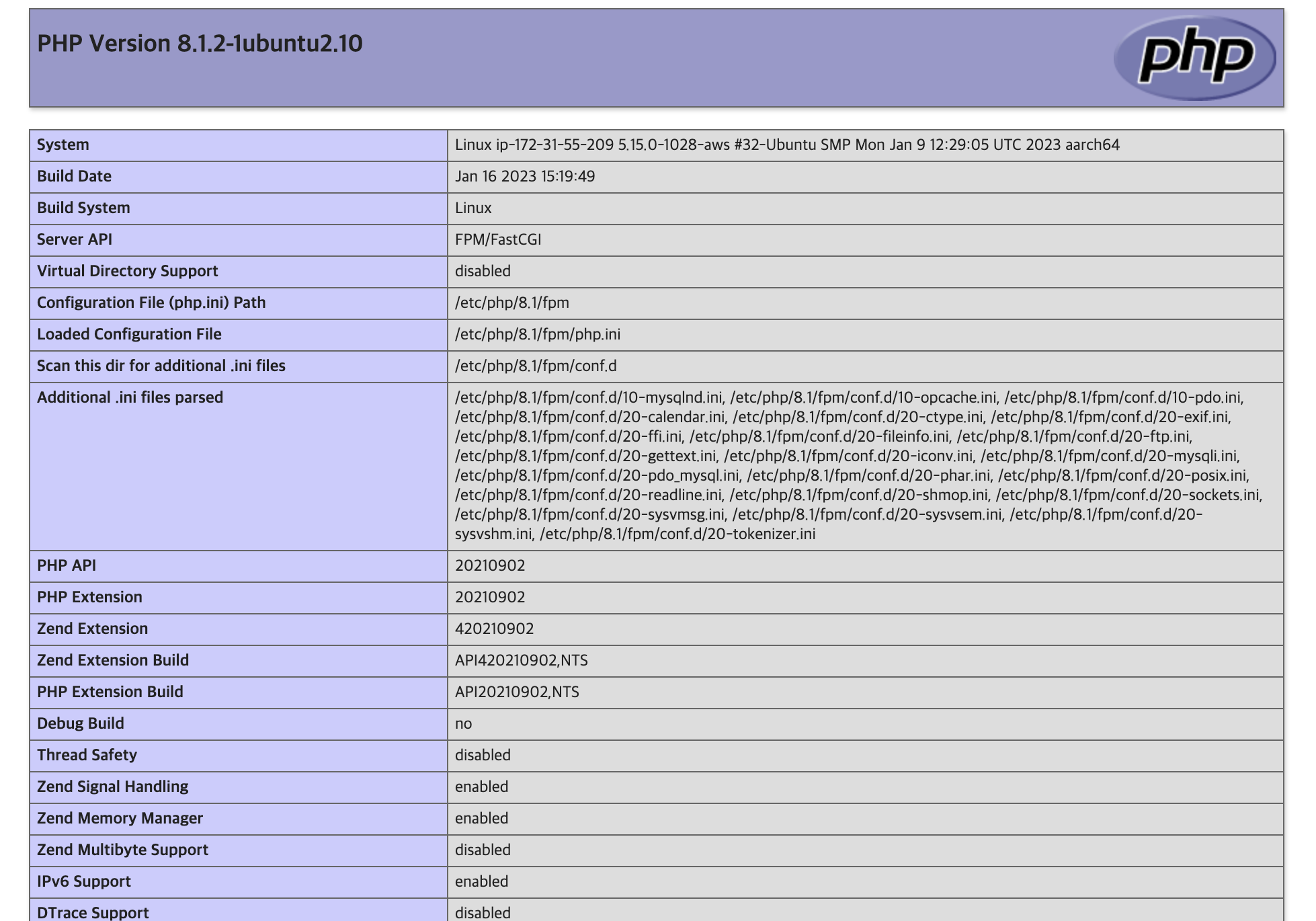 ⭕️ 다시 ec2인스턴스주소/index.php로 접근하면 phpinfo가 잘 나오는 것을 확인할 수 있습니다.