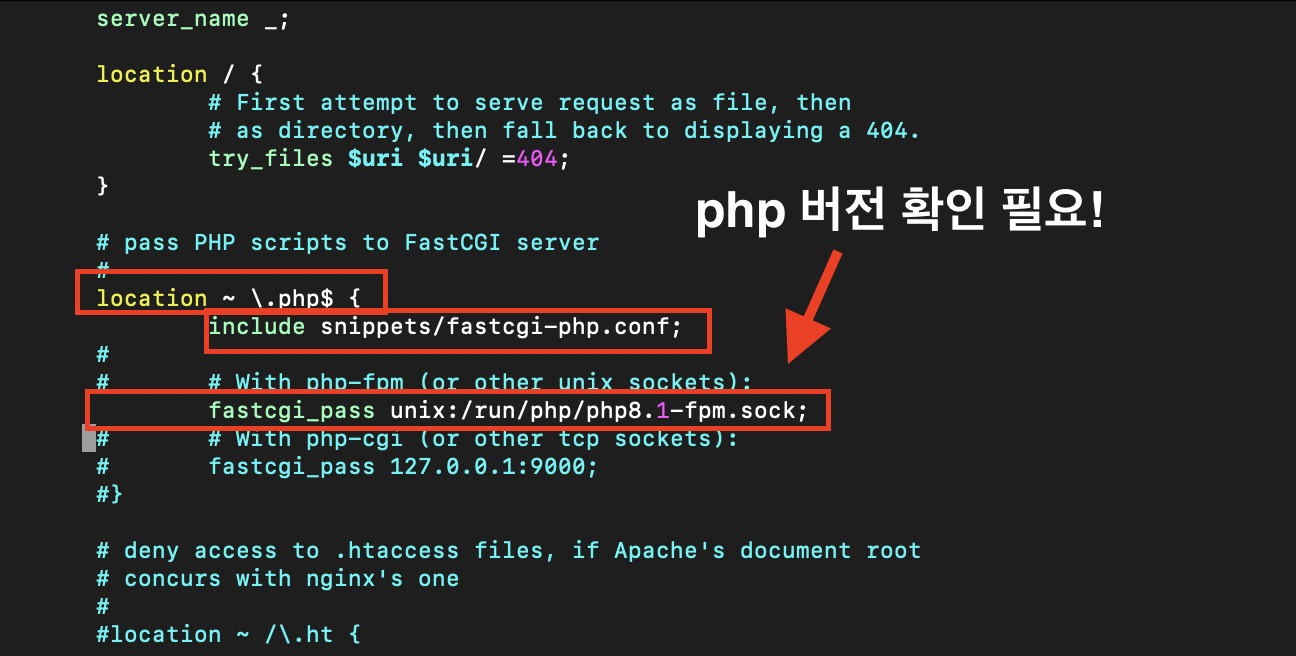 만약 잘 나오지 않고 502 Bad Gateway nginx/1.18.0 (Ubuntu)라고 뜬다면 아래 명령어를 입력 후 아래 사진처럼 설정이 되어있는지 확인합니다. 다르다면 변경 후 저장하고 다시 ec2인스턴스주소/index.php로 접근합니다.