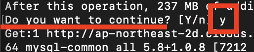 - 중간에 'Do you want to continue?' 라고 뜨면서 멈춰있다면 대문자 'Y'나 소문자 'y'를 입력합니다.