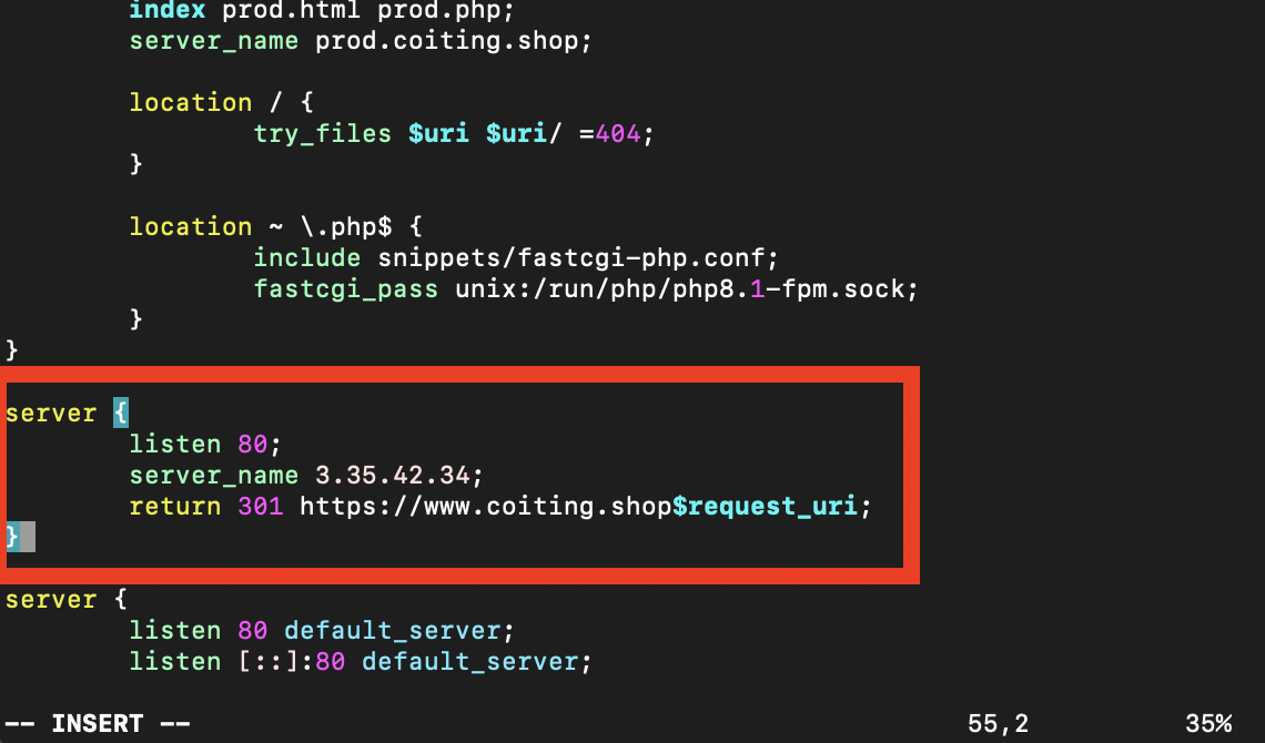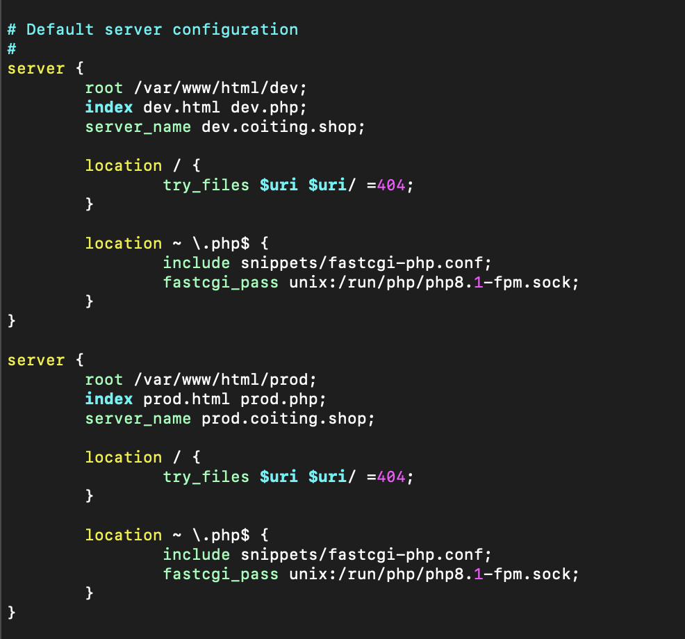 - Nginx 기본 설정 파일 /etc/nginx/sites-available/default로 들어가서 서브 도메인에 대한 추가 설정을 다음과 같이 해줍니다.