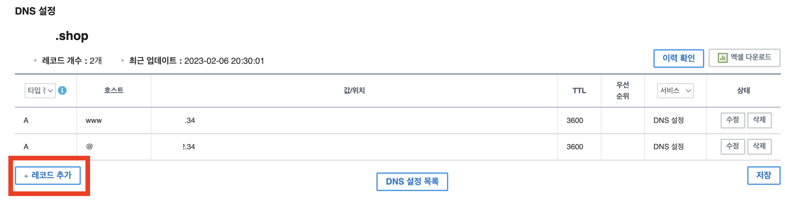 4) 레코드 추가를 클릭하고, 서브 도메인을 추가해줍니다.