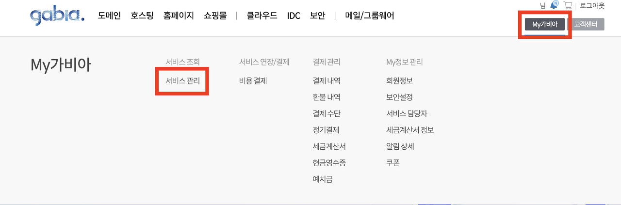 1) My가비아 → 서비스관리 페이지로 이동합니다.