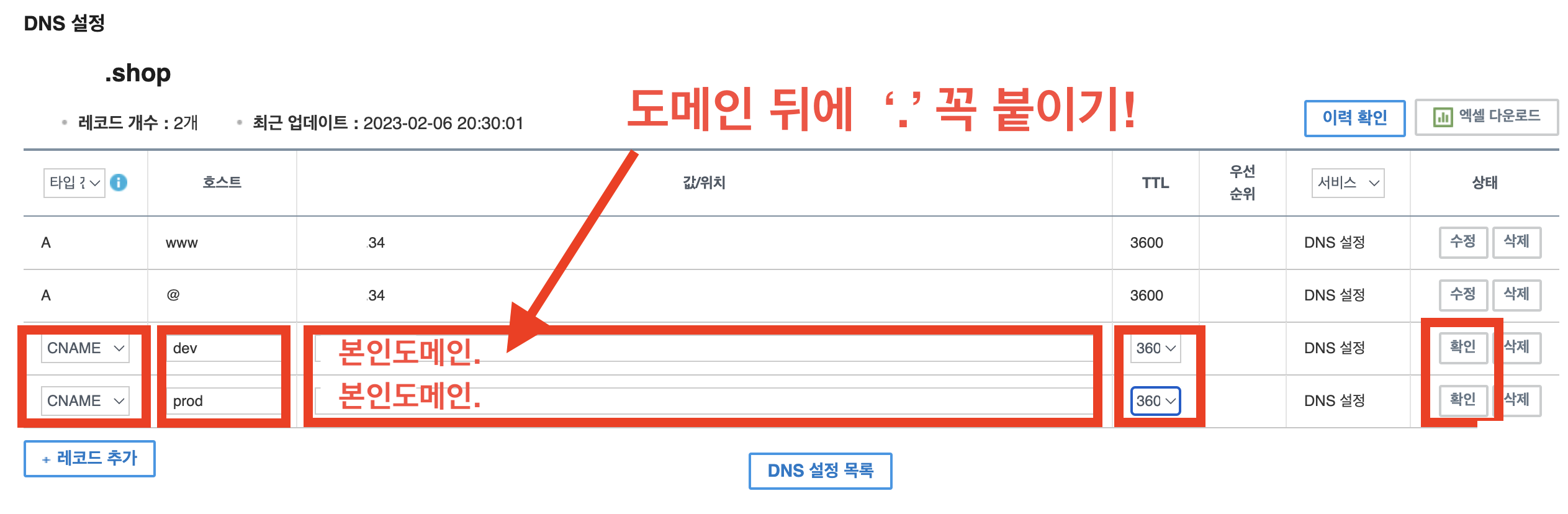 위의 과정에서 'dev'과 'prod'의 이름으로 서브 도메인을 만들었습니다.