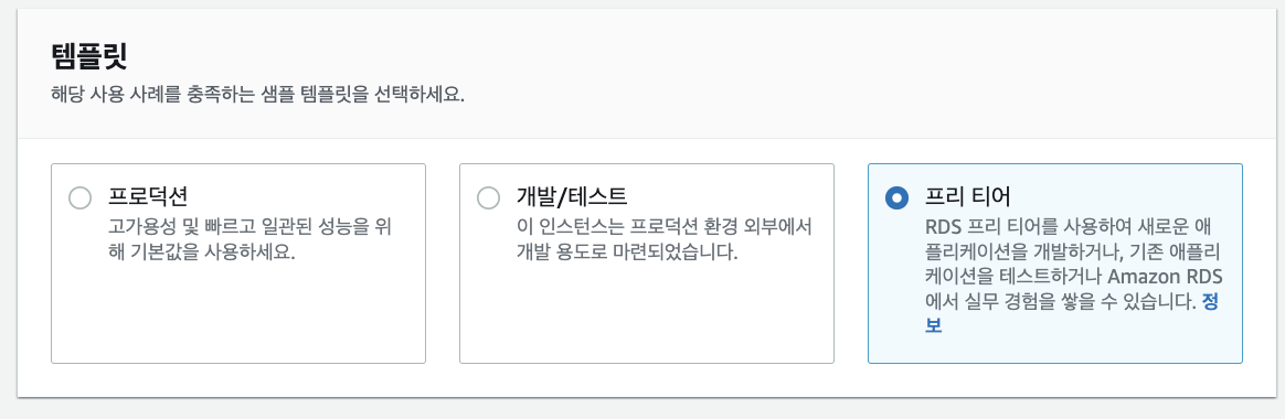 - 프리티어로 설정합니다. (이미 rds 있으면 두 번째 인스턴스는 프리티어 설정❌)