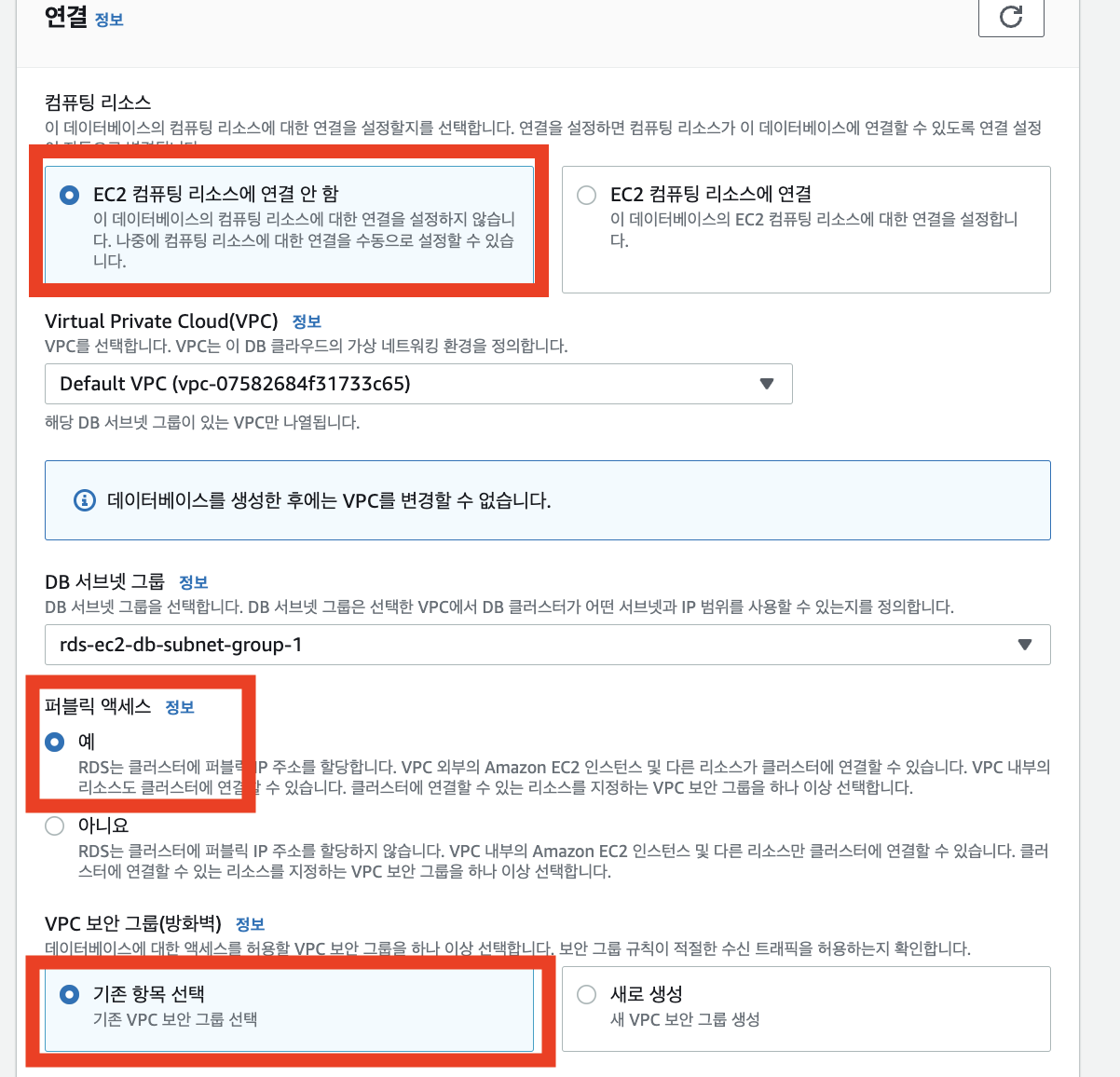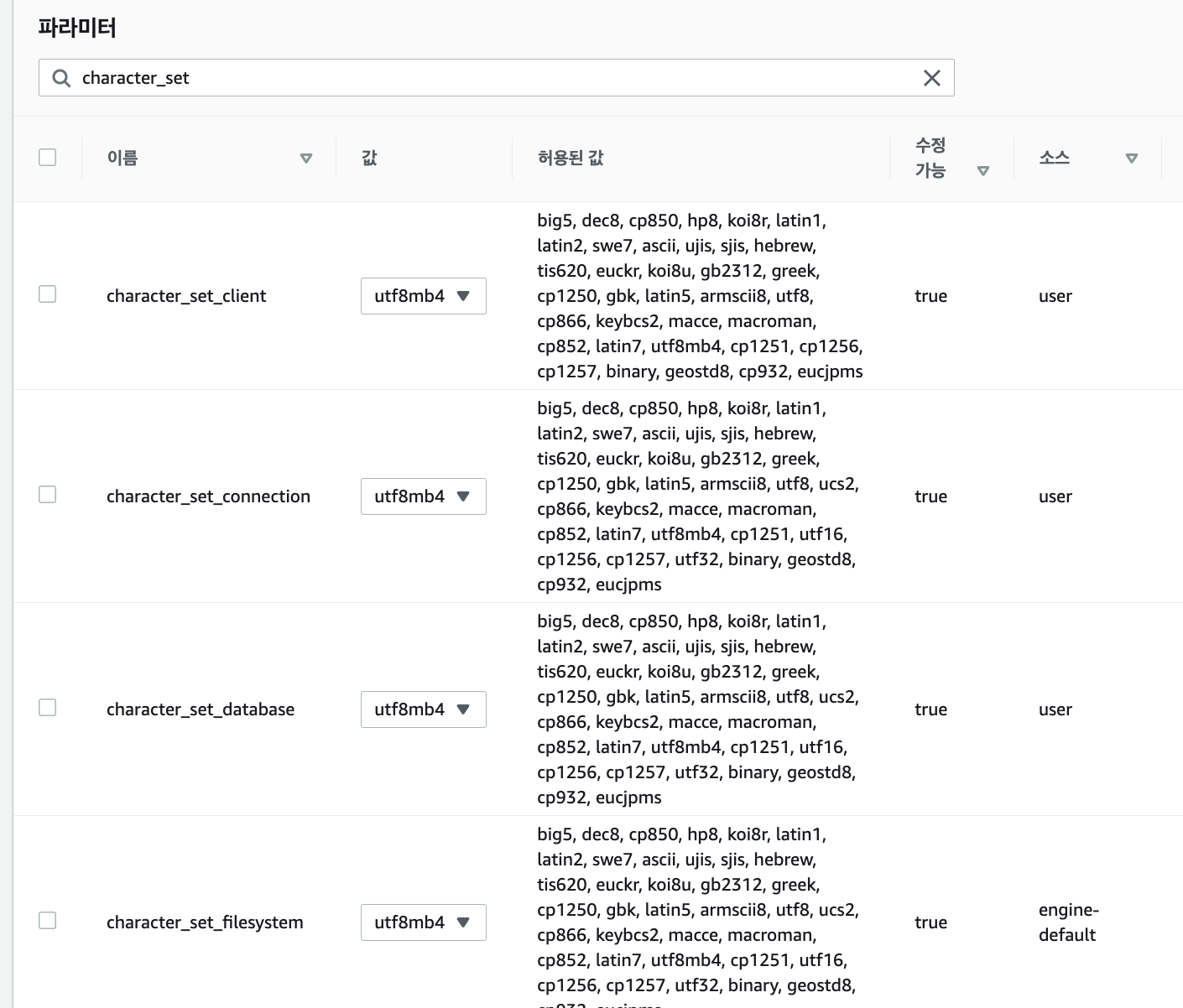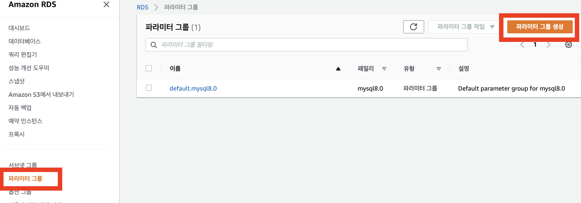 - 데이터베이스 - 수정- 추가 구성- 데이터베이스 옵션 항목에서 DB 파라미터 그룹을 default에서 수정해주면 됩니다.