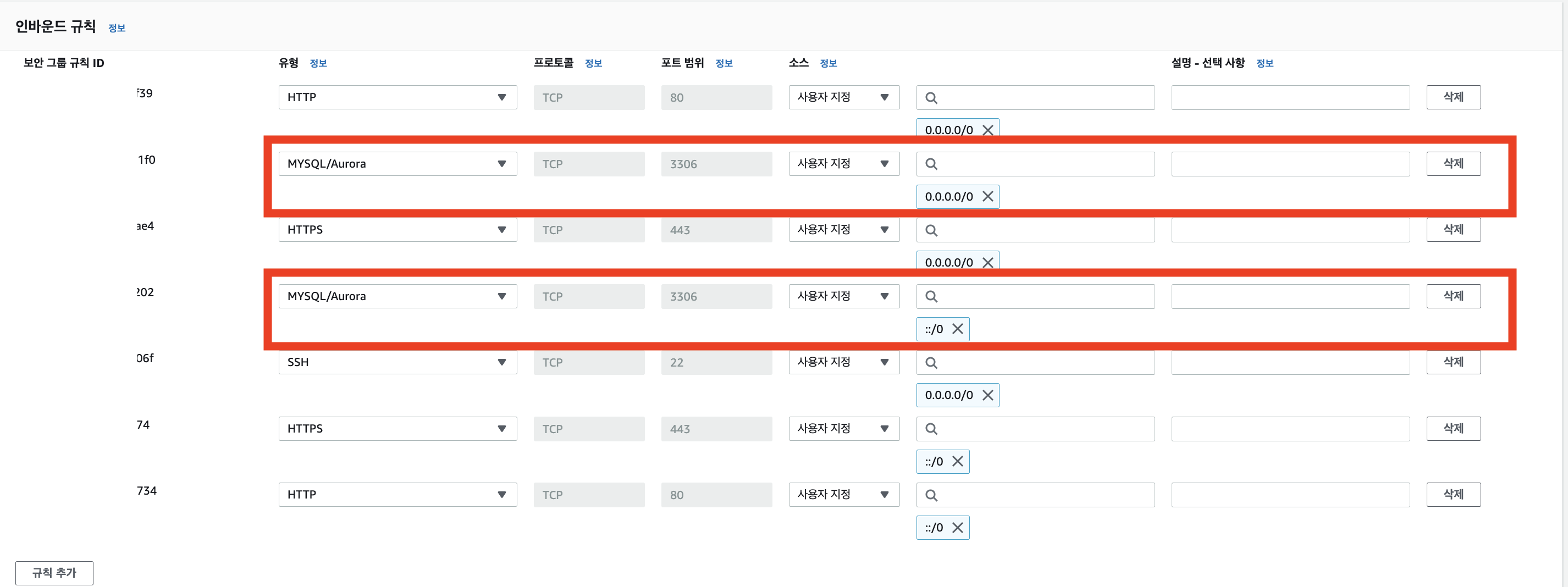 - 아래 사진처럼 MySQL/Aurora 포트(3306)에 Anywhere-IPv4, Anywhere-IPv6 소스를 모두 열어 줍니다.