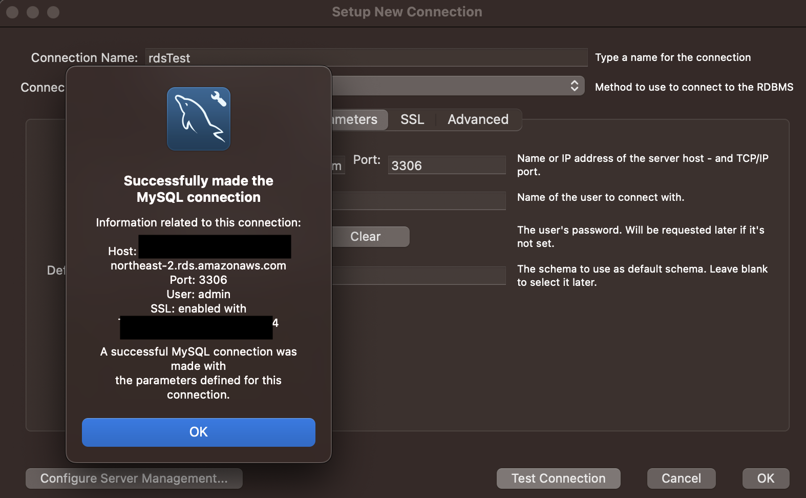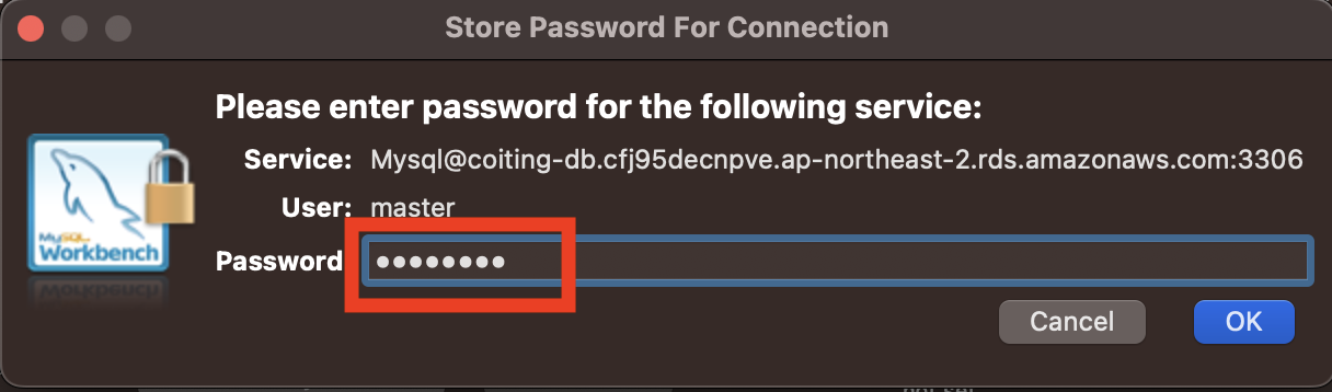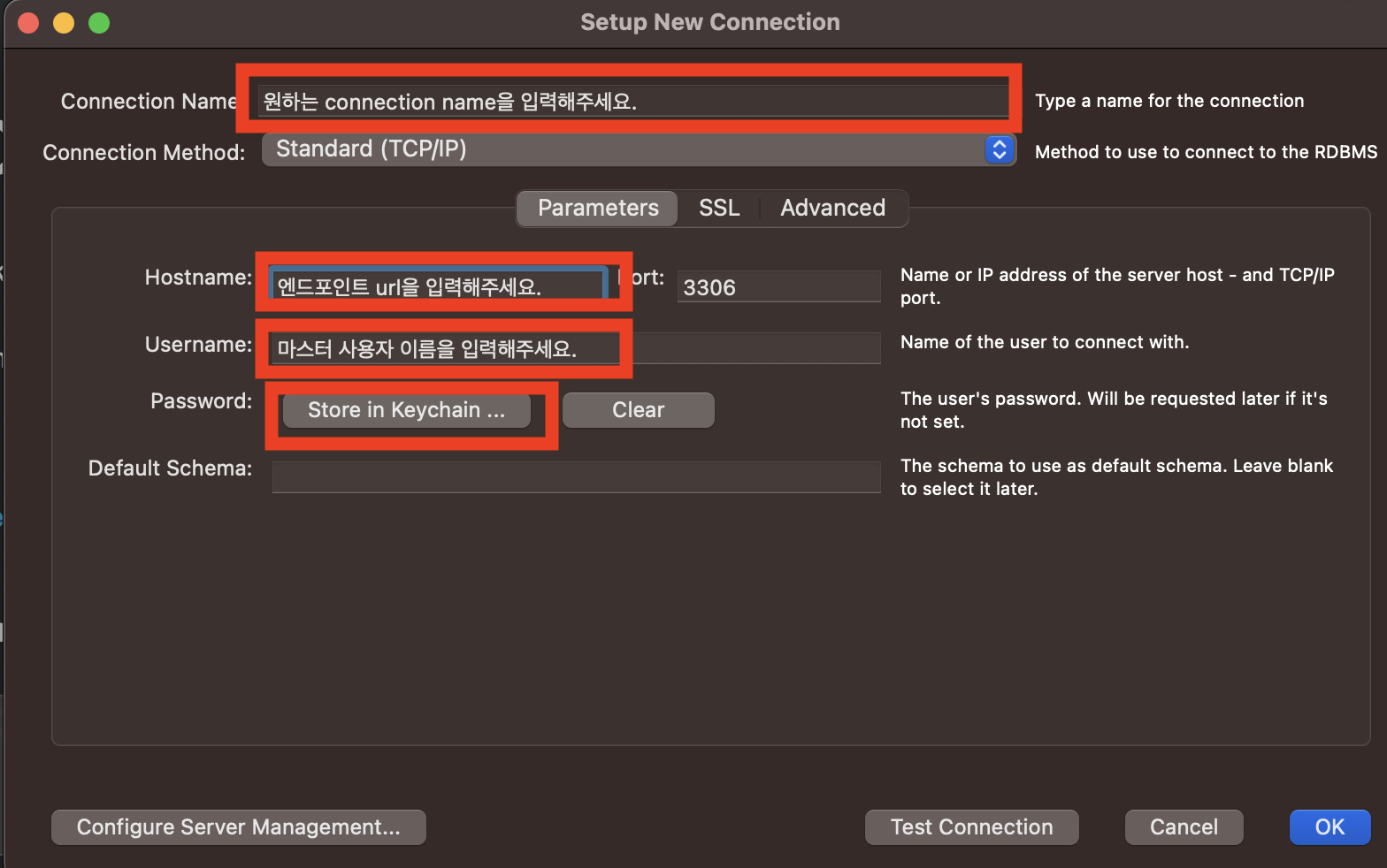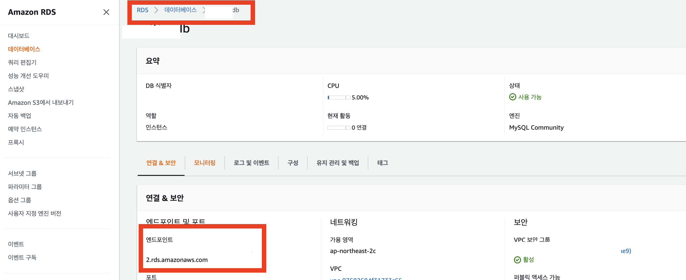 마스터 사용자 이름과, RDS 엔드포인트 주소를 확인하여 넣어줍니다.