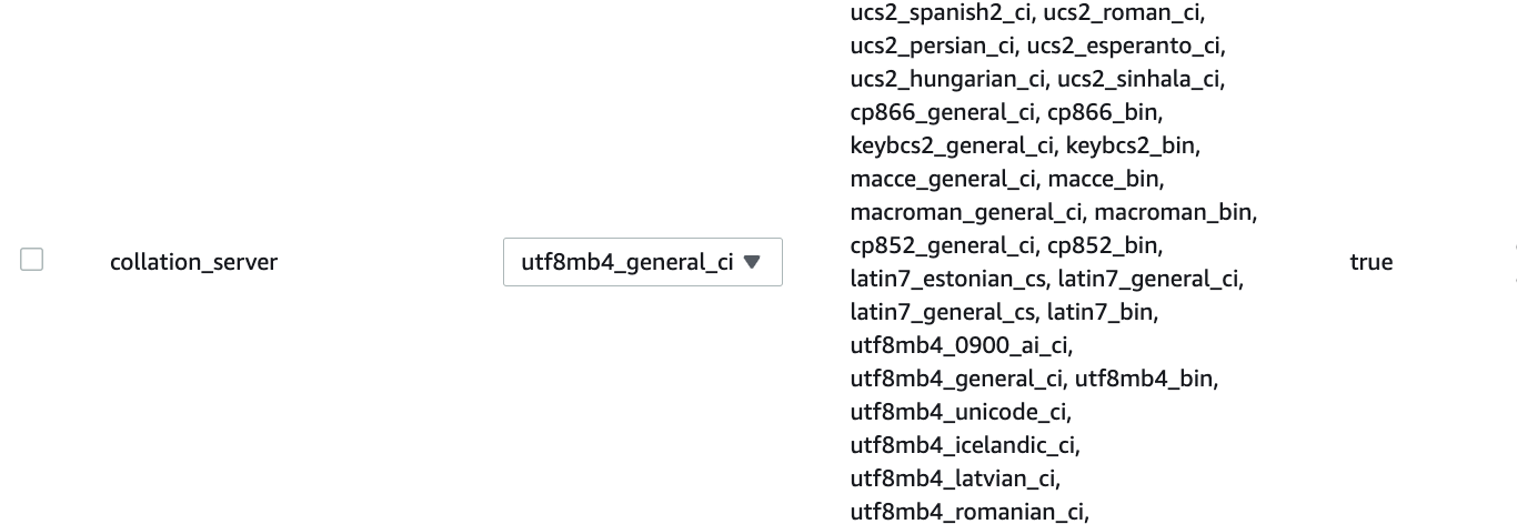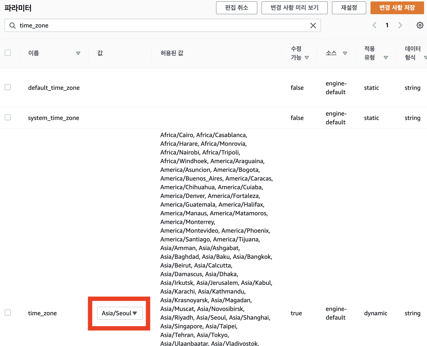 - 파라미터에서 1) collation, 2) character_set를 검색해 인코딩 설정이 가능한 항목은 모두 char : 'utf8mb4' or collation : 'utf8mb4_general_ci'로 변경해줍니다.또 타임존을 Asia/Seoul로 설정해줍니다.