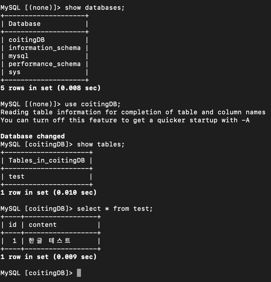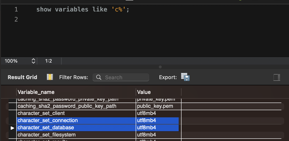 - character_set_connection 과 character_set_database가 잘 변경되었습니다.