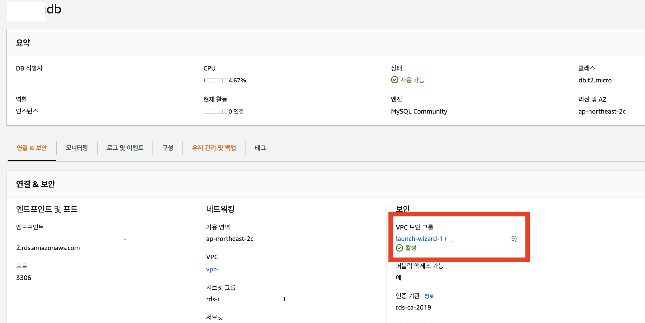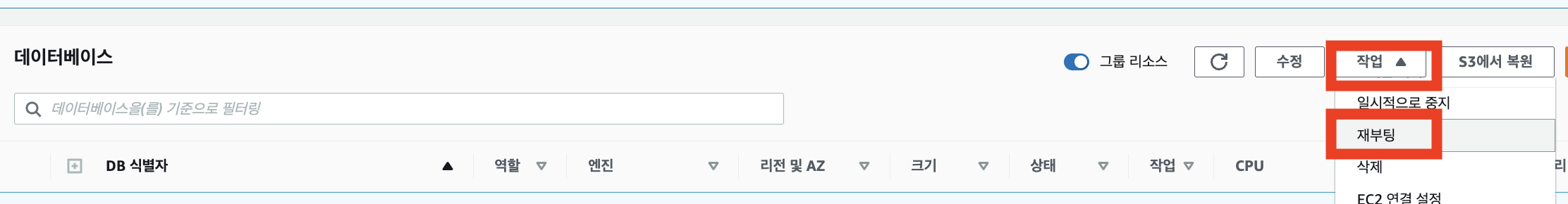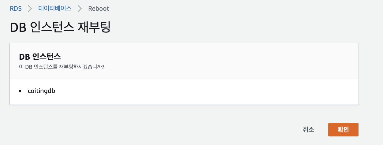 - 수정사항을 적용시키기 위해서 DB 인스턴스를 재부팅 해줍니다.
