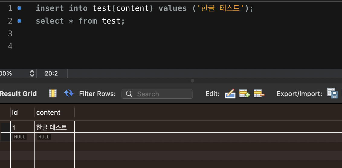 - 테이블 안에 '한글 테스트'라는 텍스트 데이터를 넣어주겠습니다.