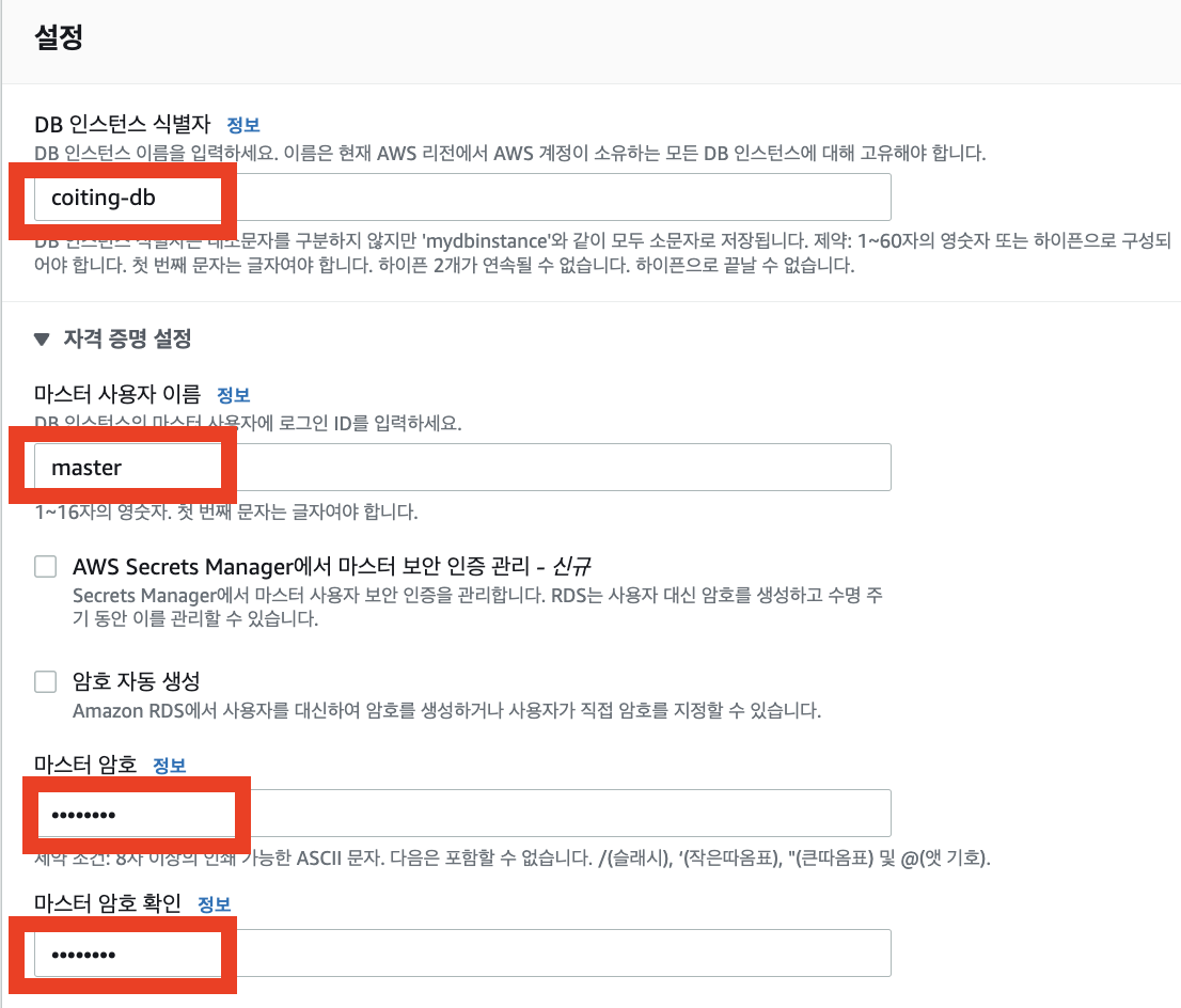 - DB 인스턴스 식별자를 자유롭게 정해주세요.