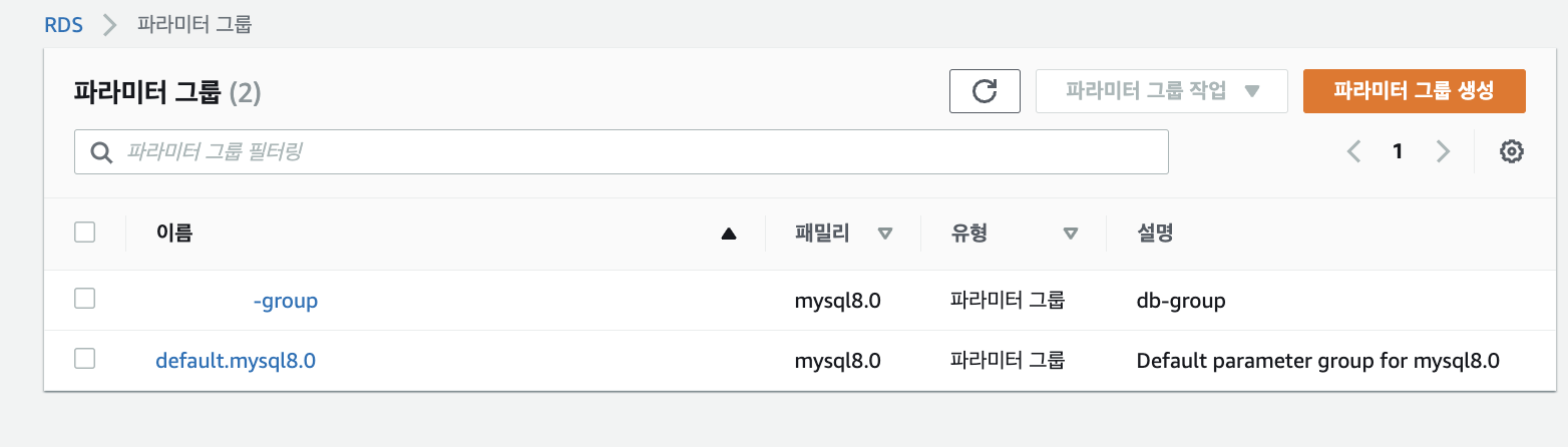 - 한글을 사용할 수 있도록 파라미터 설정을 바꿔주기 위해 파라미터 그룹을 하나 생성합니다.