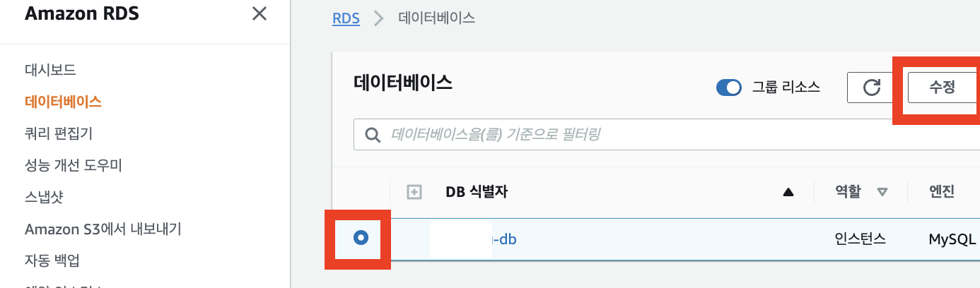 - 파라미터 그룹을 적용하기 위해 생성해둔 데이터베이스 설정을 수정합니다다.