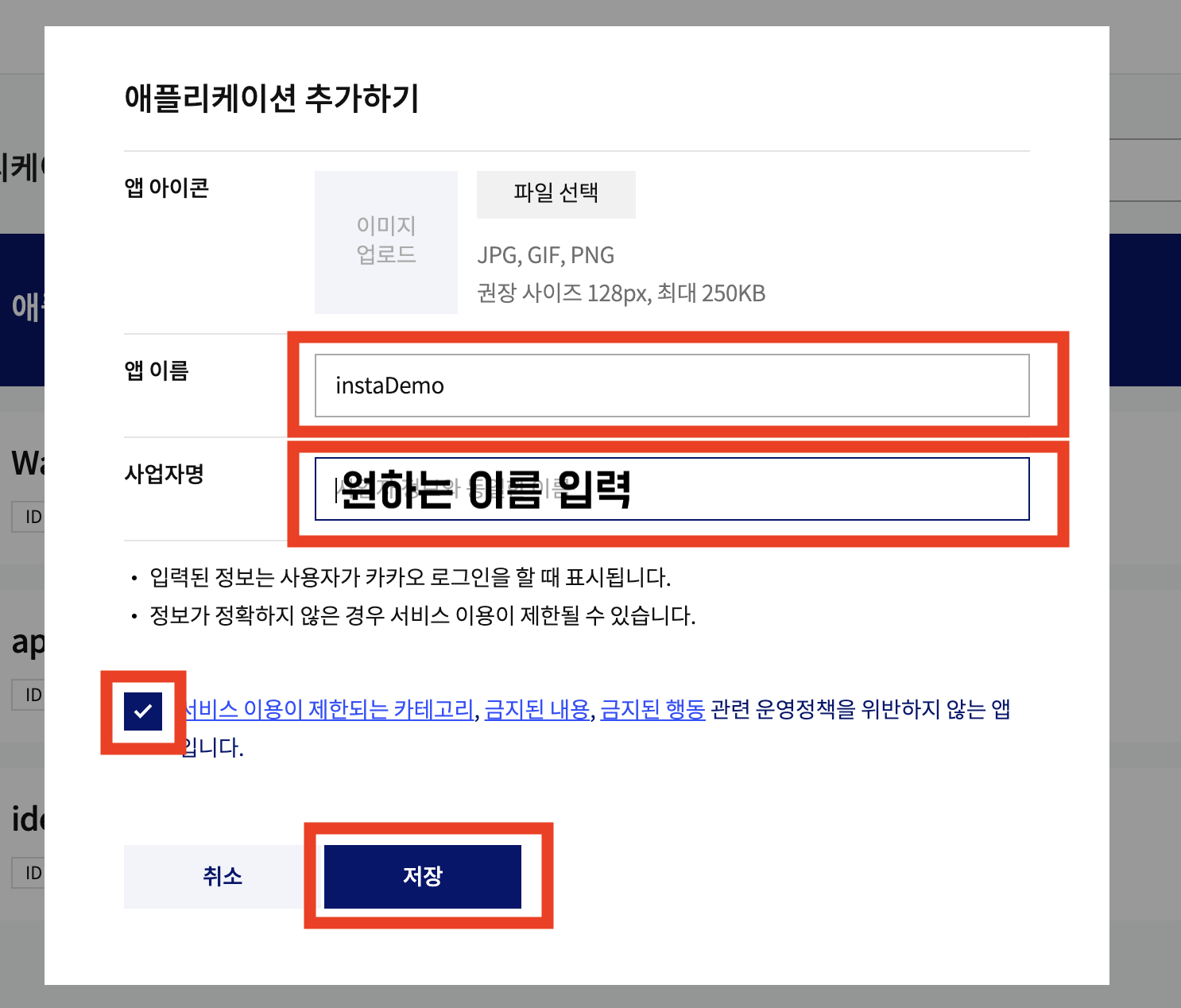 - 앱 이름, 사업자명을 입력하고 저장을 눌러줍니다.