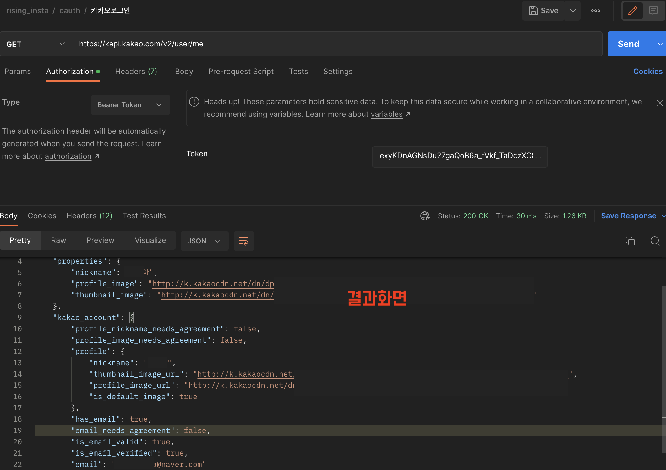 - https://kapi.kakao.com/v2/user/me가 엔트포인트며 GET 방식으로 사용자 정보를 받습니다.