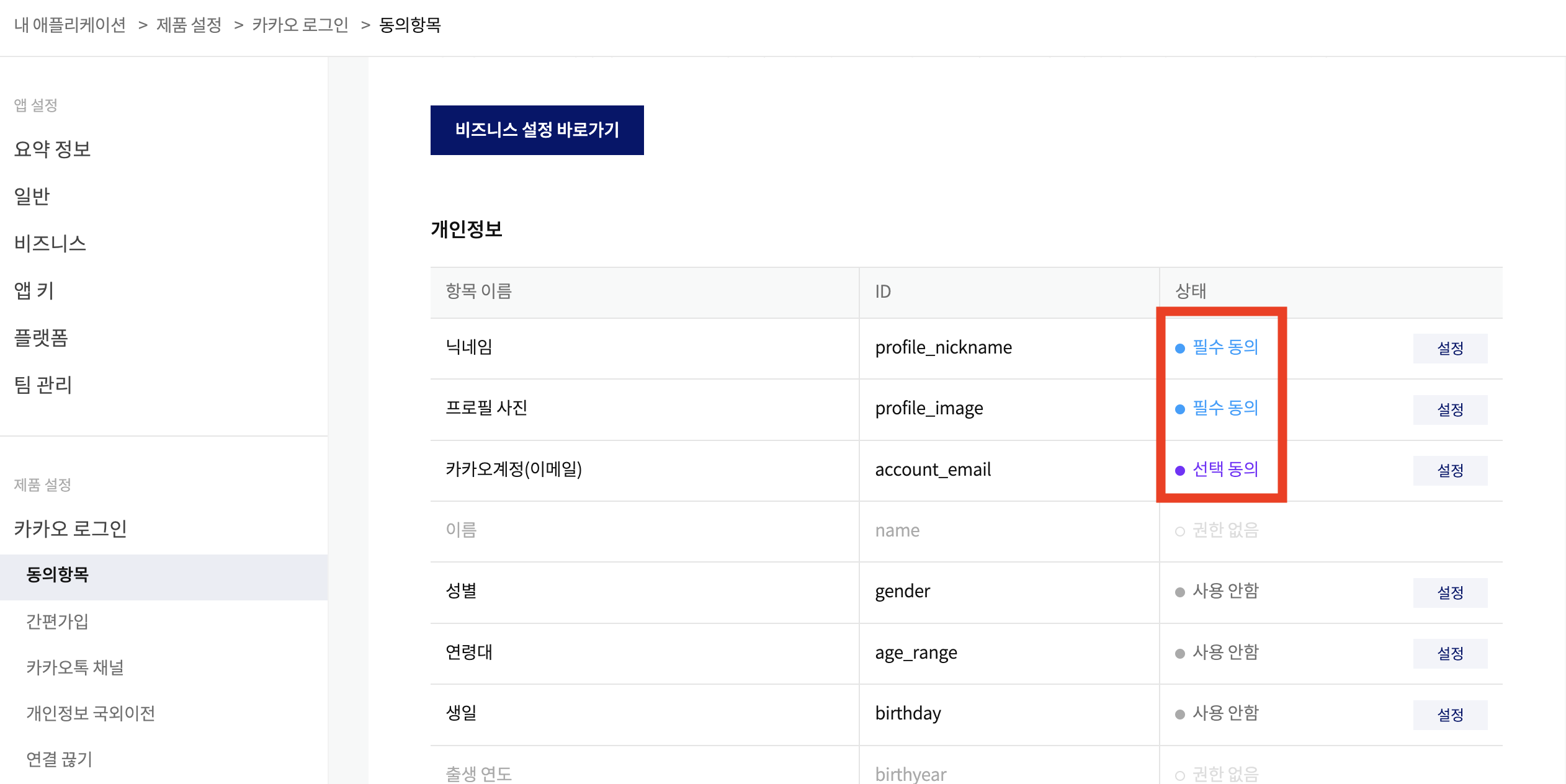 - 닉네임, 프로필 사진, 카카오 계정(이메일) 동의 항목을 설정해줍니다.