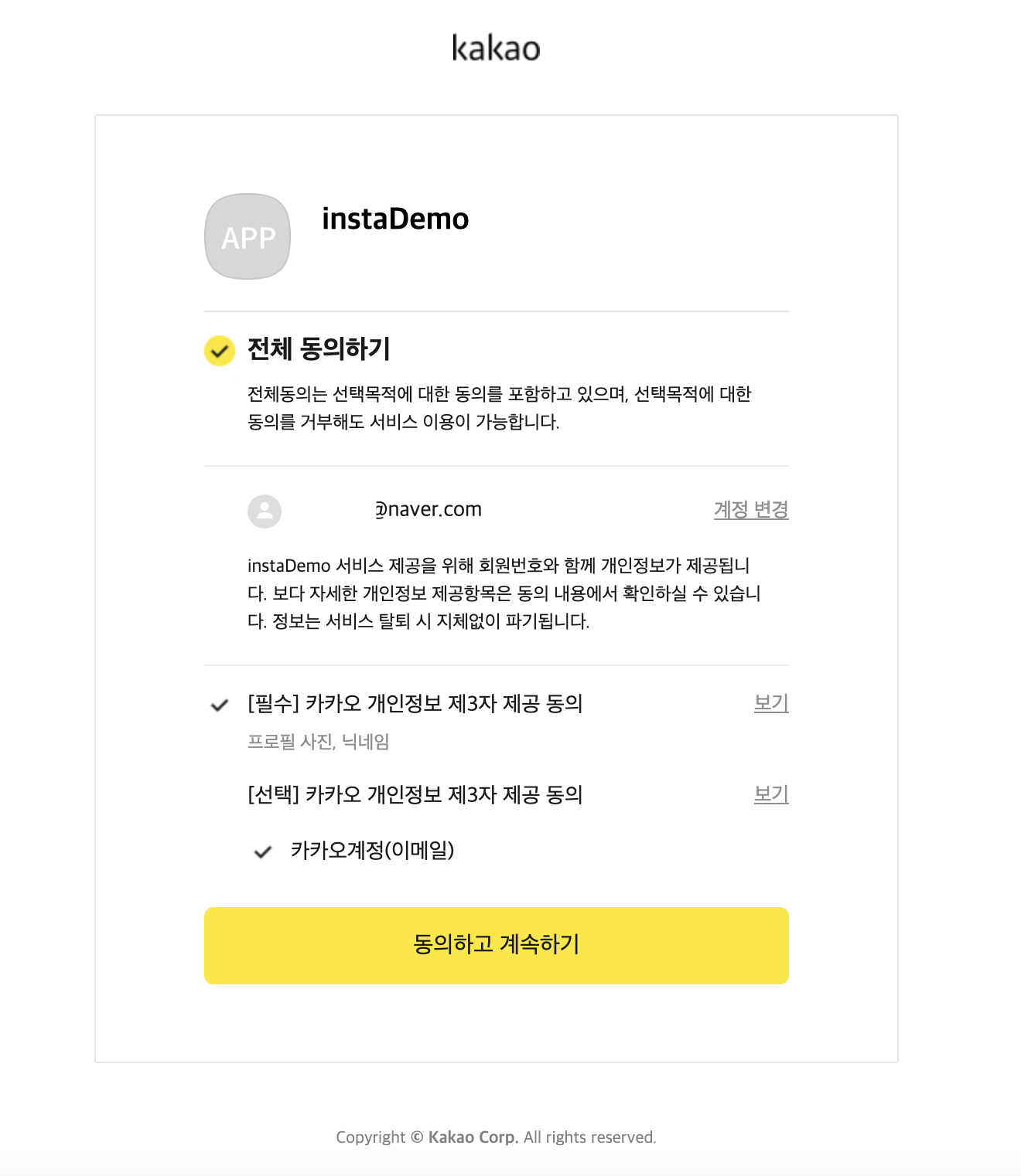 카카오에서 앱 등록과 OAuth를 이용하기 위한 절차가 완료되었습니다.