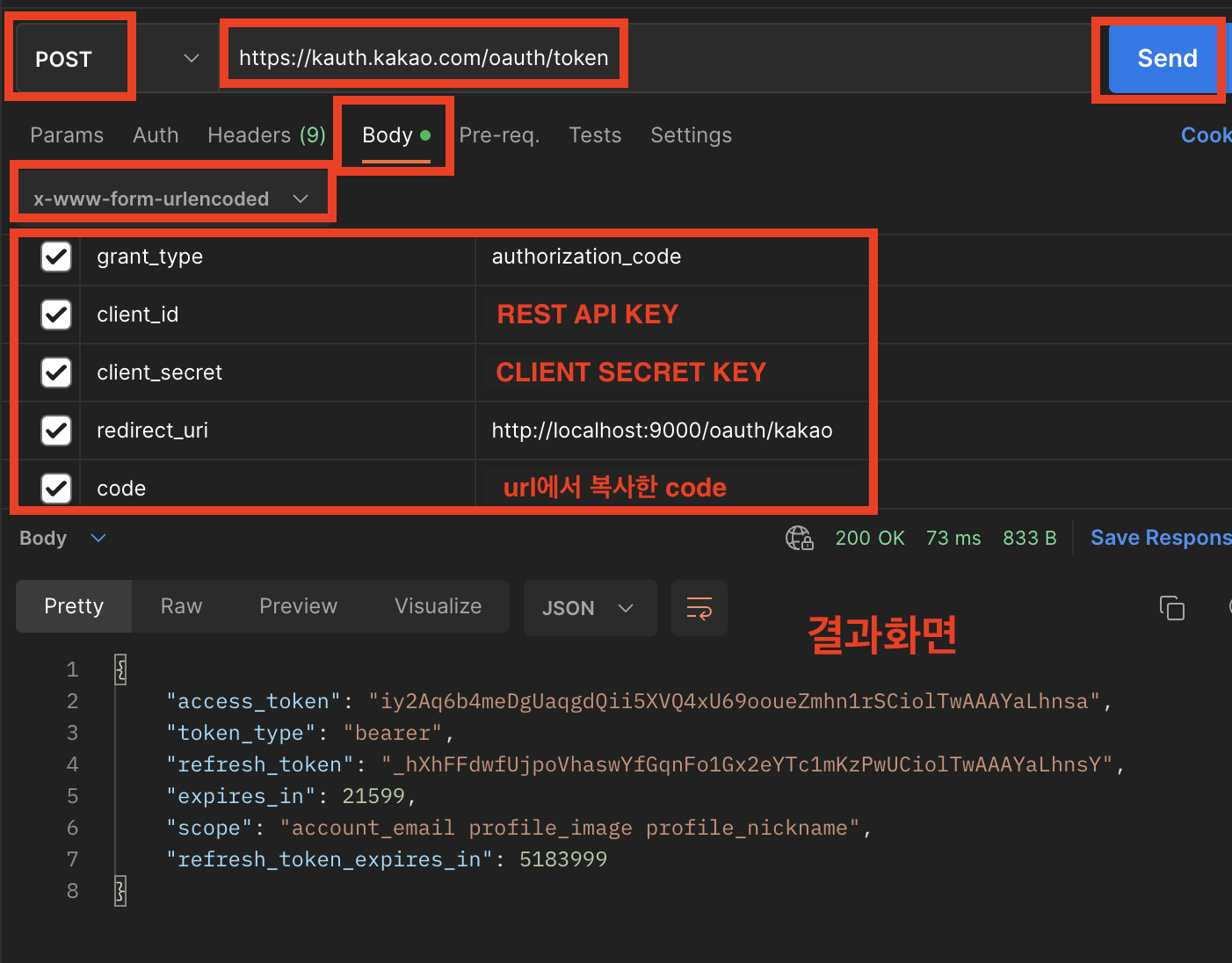 - Body는 grant_type, client_id, client_secret, redirect_uri, code 값을 붙여줍니다.