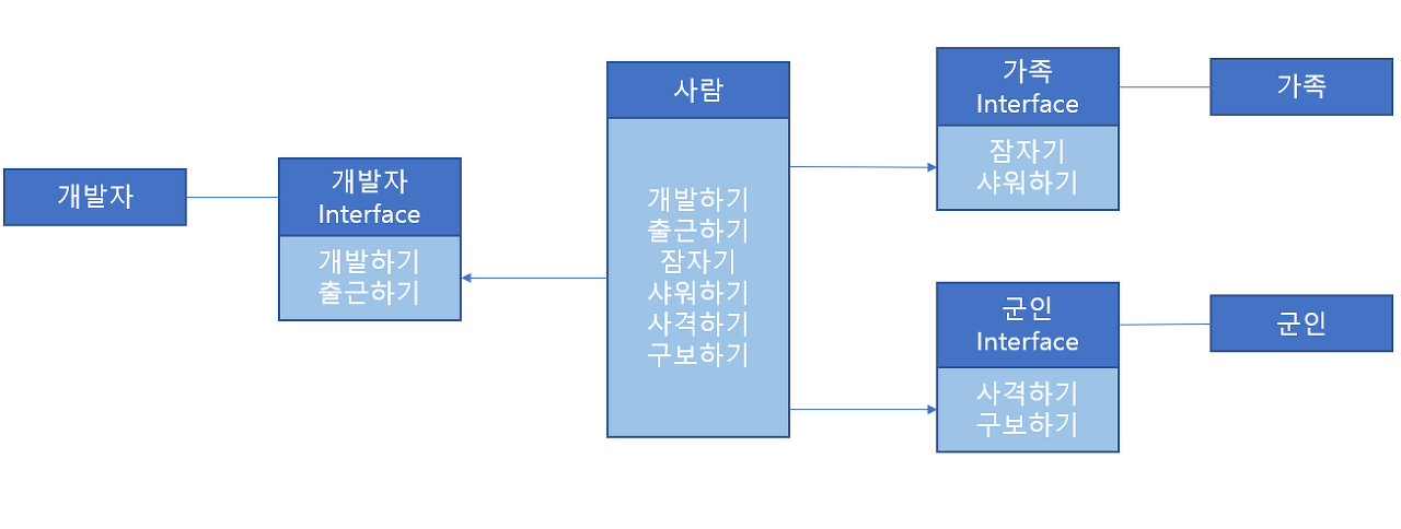 즉, 인터페이스 분리 원칙이란 클라이언트의 목적과 용도에 적합한 인터페이스 만을 제공하는 것입니다. 인터페이스 분리 원칙을 준수함으로써 모든 클라이언트가 자신의 관심에 맞는 퍼블릭 인터페이스(외부에서 접근 가능한 메세지)만을 접근하여 불필요한 간섭을 최소화할 수 있으며, 기존 클라이언트에 영향을 주지 않은 채로 유연하게 객체의 기능을 확장하거나 수정할 수 있습니다.