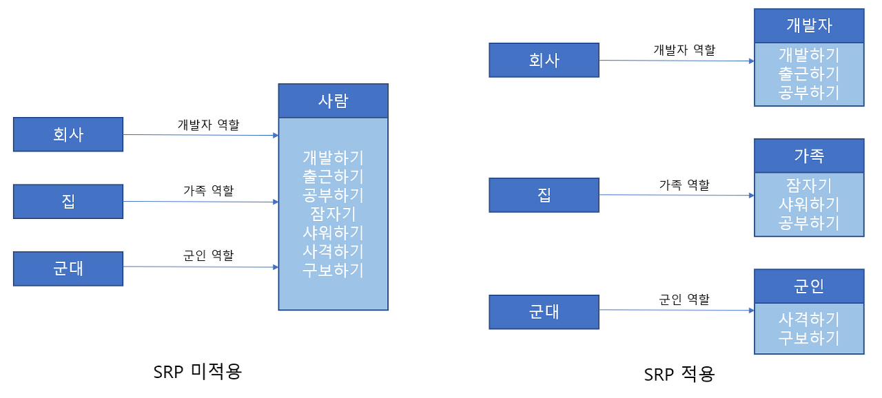 SRP는 하나의 모듈이 하나의 책임을 가져야 한다는 모호한 원칙으로 해석하면 안됩니다. 대신 모듈이 변경되는 이유가 한가지여야 함으로 받아들여야 합니다. 여기서 변경의 이유가 한가지라는 것은 해당 모듈이 여러 대상 또는 액터들에 대해 책임을 가져서는 안되고, 오직 하나의 액터에 대해서만 책임을 져야 한다는 것을 의미합니다.