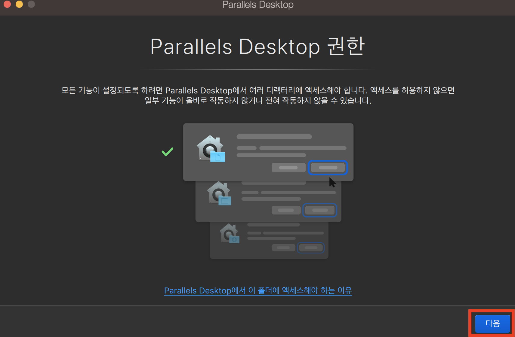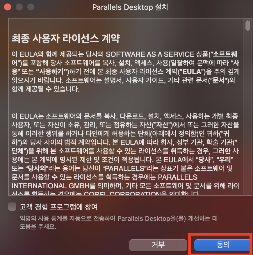 4) 다운로드한 파일을 클릭해 열고, Parallels Desktop 설치를 클릭합니다.