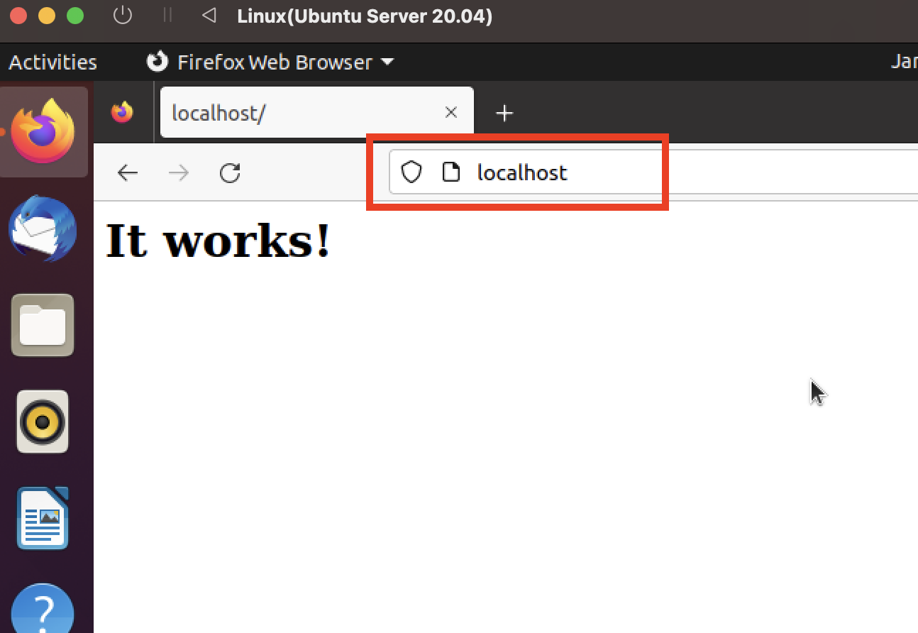 - firefox 주소창에 localhost을 입력하고 It works!가 나오면 설치가 잘 된 것입니다.