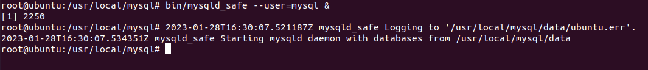 /usr/local/mysql $ bin/mysqld_safe --user=mysql &