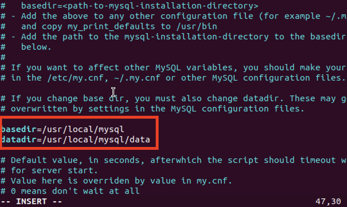 - mysqld 파일의 basedir과 datadir 뒤에 경로를 추가합니다.