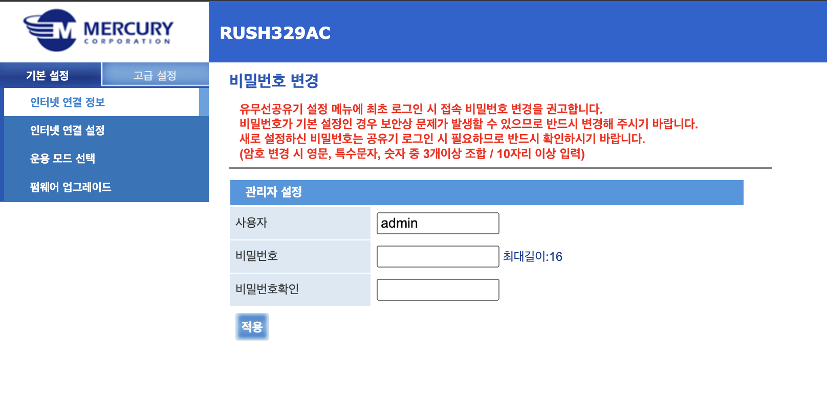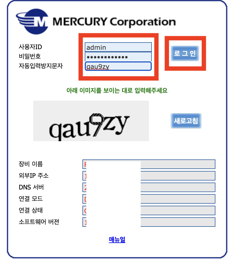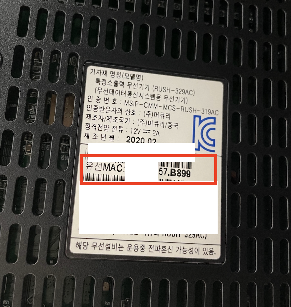- 사용자ID는 admin이고 비밀번호는 공유기 뒤를 보면 '유선 MAC'의 주소 뒤 6자리 과 _admin을 입력하시면 됩니다.