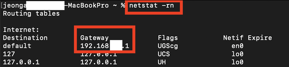 터미널을 킨 후 아래 명령어를 입력하면 기본 게이트웨이를 확인할 수 있습니다.