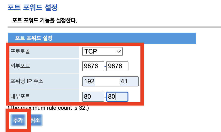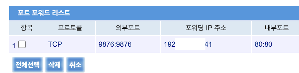 - 포워딩 IP 주소에는 내부 IP 주소를 입력해줍니다.