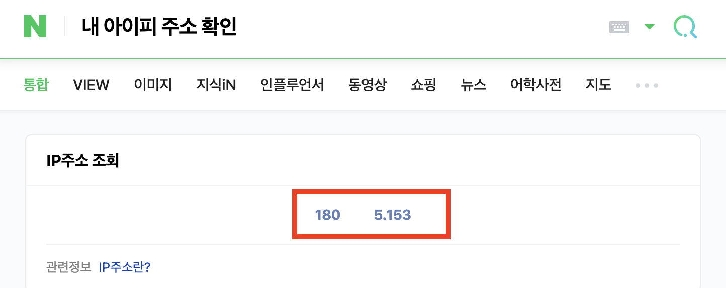 네이버에 '내 아이피 주소 확인'을 입력하면 확인할 수 있습니다. 아래 링크를 통해 확인합니다.