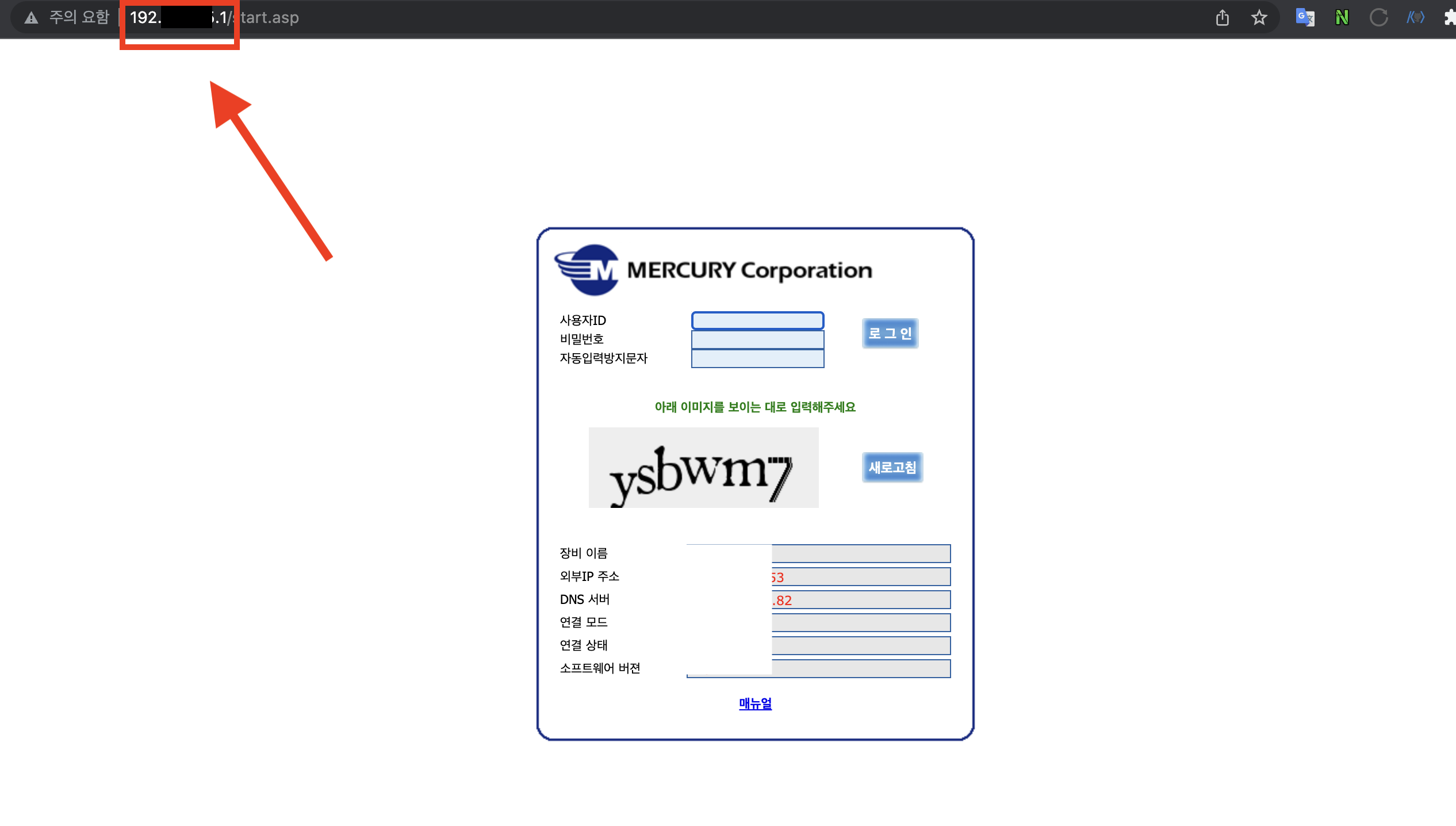5) 기본 게이트웨이를 url 창에 입력하여 공유기 페이지에 접속합니다.