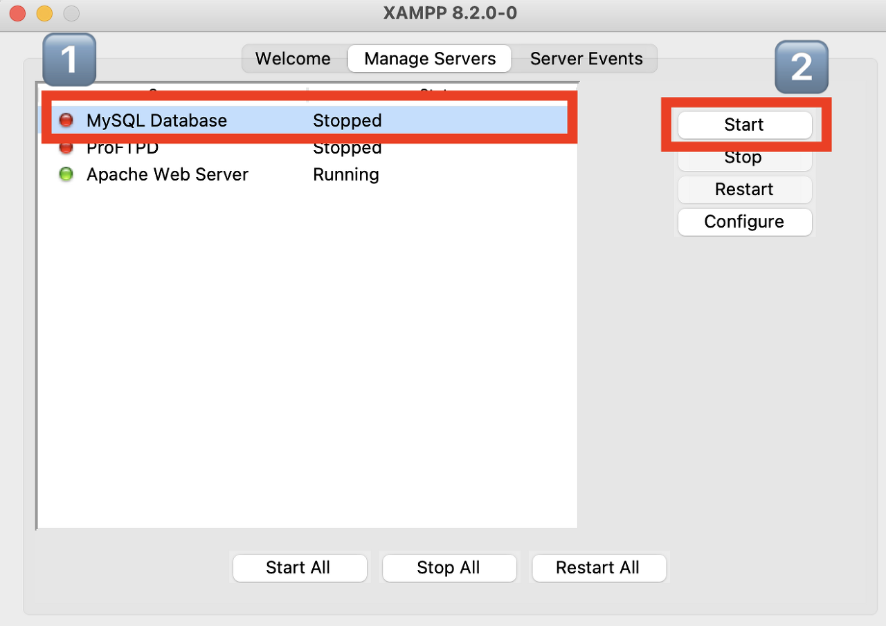 3) 1️⃣번을 클릭하고 2️⃣번을 클릭하여 서버를 실행시킵니다.