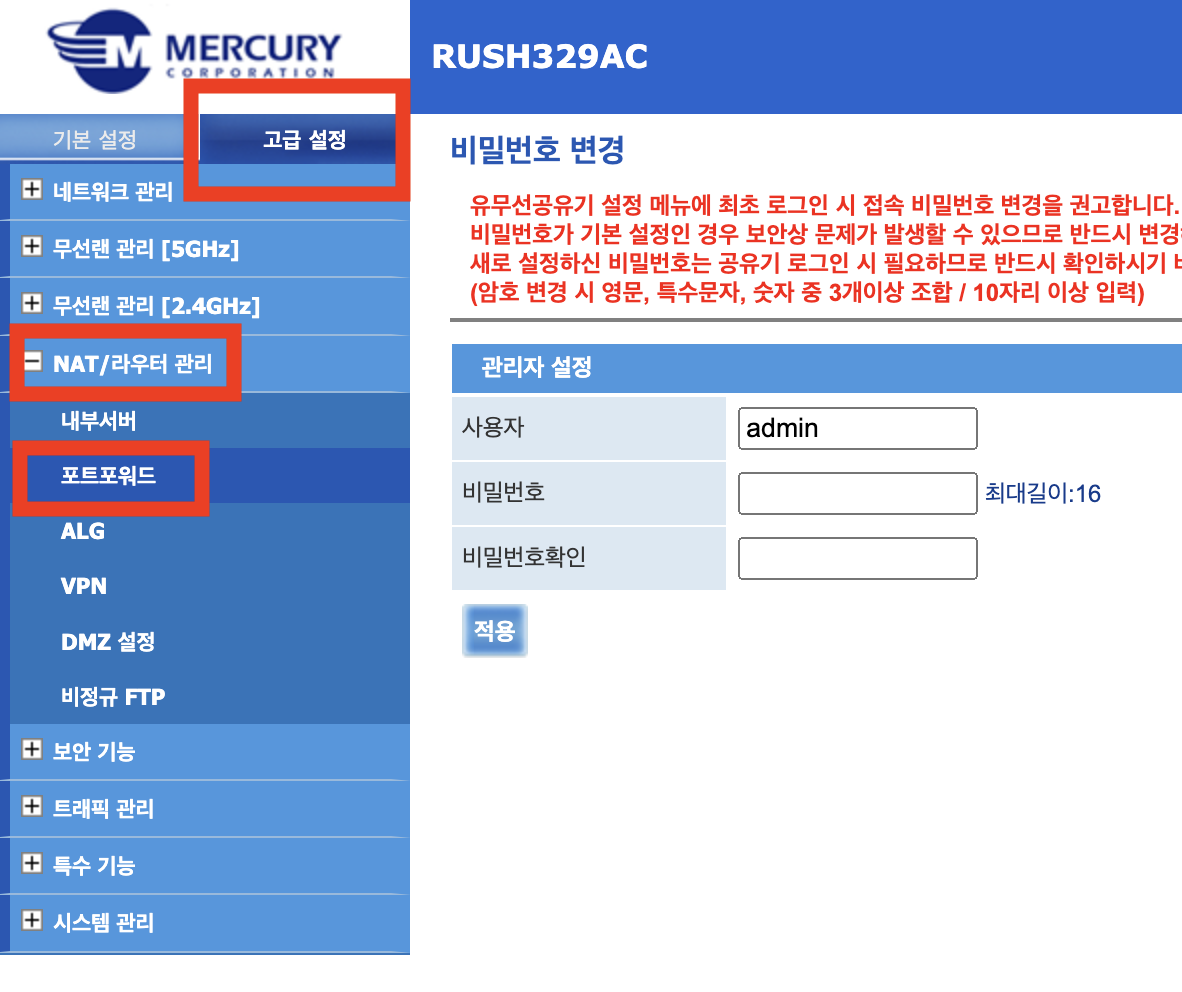 고급설정을 누르고 NAT/라우터 관리에서 포트포워드를 클릭합니다.