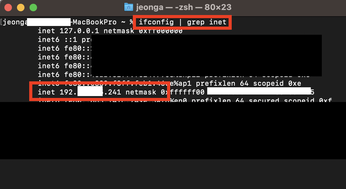 터미널을 킨 후 아래 명령어를 입력하면 내부 IP 주소를 확인할 수 있습니다.